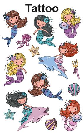 Gyönyörű sellők - akik most a bőrödön siklanak. Válaszd ki a kedvenced! Lepje meg gyermekeit fantasztikus tetoválásokkal, amelyek tökéletesek ajándékként, jutalomként, születésnapi partikhoz vagy egyszerűen csak játékként.